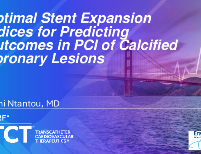 Presentation TCT 2025 TCT 156: Optimal Stent Expansion Indices for Predicting Outcomes in PCI of Calcified Coronary Lesions Presenter: Eleni Ntantou October 26, 2025 REGISTER for free or LOG IN to view this content TCT 2025 Up Next Presentation TCT 2025 TCT 158: IVUS but not Angiographically Derived Stent Enhancement Tools Can Differentiate the Scoring Mechanisms of Calcified Coronary Lesions Presenter: Stephane G. Carlier October 26, 2025 More slides + Presentation TCT 2025 TCT 160: Intravascular Lithotripsy for Severely Calcified Coronary Lesions: Morphological and Prognostic Insights from an IVUS-Based Study Presenter: Jiawei Wu October 26, 2025 Presentation TCT 2025 TCT 977: Acute Effects of Transcatheter Tricuspid Valve Replacement on Right Heart Hemodynamics Presenter: Tyler Andrews October 26, 2025 We Recommend Disclosures <p>Nothing to disclose</p>