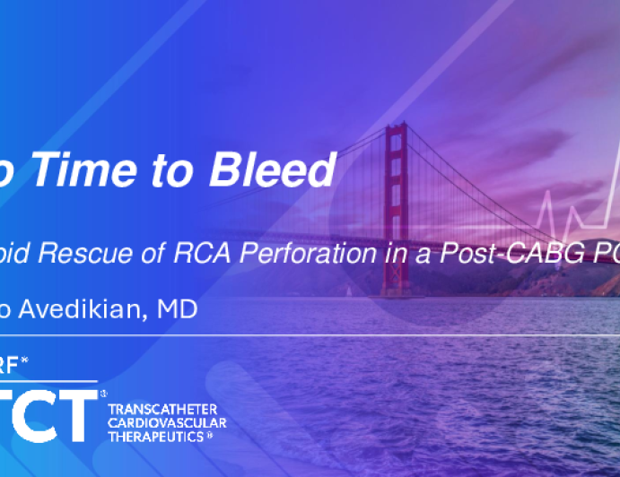 Presentation TCT 2025 TCT 1561: No Time to Bleed: Rapid Rescue of RCA Perforation in a Post-CABG PCI Presenter: Saro Avedikian October 28, 2025 REGISTER for free or LOG IN to view this content TCT 2025 Up Next Presentation TCT 2025 TCT 1384: No Ctrl+Z in the Cath Lab: Decisions, Disaster and Deliverance Presenter: Rajesh Natuva October 28, 2025 More slides + Presentation TCT 2025 TCT 1382: Rescuing Suicide Left Ventricle Post-TAVR: Emergent Mitral Edge‑to‑Edge Repair and Valve Post‑Dilation Restore Hemodynamic Stability Presenter: Teja Sanjiv Chakrala October 28, 2025 Presentation TCT 2025 TCT 1425: Transfemoral Transcatheter Aortic Valve Implantation in Severe Aortic Regurgitation (AR) Due to Aortic Valve Leaflet Perforation: Pure AR-Dedicated Device Presenter: Ho On Alston Conrad Chiu October 28, 2025 We Recommend Disclosures <p>Nothing to disclose</p>