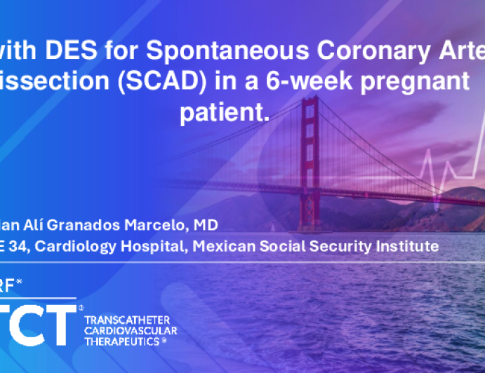 Presentation TCT 2025 TCT 1573: PCI With DES for Spontaneous Coronary Artery Dissection (SCAD) in a 6-Week Pregnant Patient Presenter: Cristian Ali Granados Marcelo October 25, 2025 REGISTER for free or LOG IN to view this content TCT 2025 Up Next Presentation TCT 2025 TCT 1670: Navigating PCI Challenges in Situs Inversus Totalis Presenter: Sayed Irfan Kazi October 25, 2025 More slides + Presentation TCT 2025 A Primer on Contemporary Diagnosis and Management of MINOCA Presenter: Lukasz Koltowski October 25, 2025 Presentation TCT 2025 TCT 1690: Coronary Arteries Affected by Huge Aneurysms in the Course of IgG4-Dependent Disease Presenter: Tomasz Suchecki October 25, 2025 We Recommend Disclosures <p>Nothing to disclose</p>