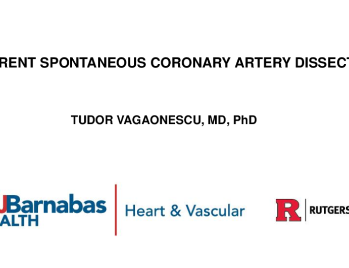 Presentation TCT 2025 TCT 1574: Recurrent Spontaneous Coronary Artery Dissection Presenter: Tudor D. Vagaonescu October 25, 2025 REGISTER for free or LOG IN to view this content TCT 2025 Up Next Presentation TCT 2025 My Tips and Tricks for Prevention and Management of Equipment Disasters Presenter: Tuomas T. Rissanen October 25, 2025 More slides + Presentation TCT 2025 TCT 1810: Percutaneous Coronary Intervention Supported by a Pulsatile Hemodynamic Assist Device in a Patient With Severe Ventricular Dysfunction and Severe Coronary Disease Presenter: Lucas Oliveira October 25, 2025 Presentation TCT 2025 TCT 1575: Spontaneous Left Main Coronary Artery Dissection Leading to LAD Flow Compromise and Circumflex Thrombosis Presenter: Alejandro Goldsmit October 25, 2025 We Recommend Disclosures <p>Nothing to disclose</p>