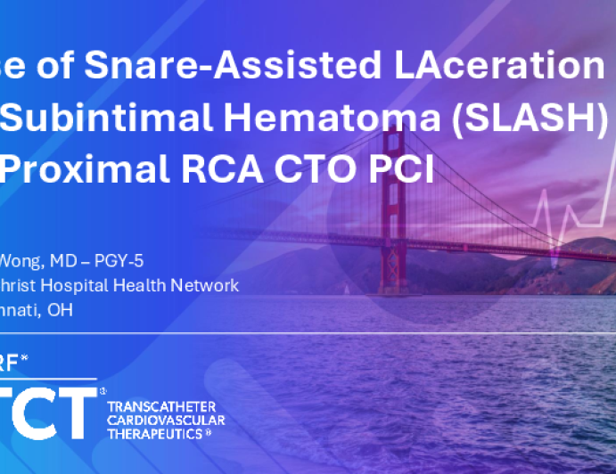 Presentation TCT 2025 TCT 1581: Use of Snare-Assisted Laceration of Subintimal Hematoma (SLASH) in Proximal RCA CTO PCI Presenter: Alan Wong October 26, 2025 REGISTER for free or LOG IN to view this content TCT 2025 Up Next Presentation TCT 2025 TCT 1584: A Case of LAD CTO With Full Moon-like Heavy Calcified Plaque Presenter: Tomohiro Yamasaki October 26, 2025 More slides + Presentation TCT 2025 TCT 1580: Hydrodynamic Contrast Modulation (HDR) in CTO PCI: A Case Study of Single-Access LAD CTO With Ipsilateral Collaterals Presenter: Brian Heng Li October 26, 2025 Presentation TCT 2025 TCT 1733: Impella-Assisted Complex Left Main PCI With Combined Calcium Modification Techniques Presenter: Gian Manuel Jimenez-Rodriguez October 26, 2025 We Recommend Disclosures <p>Nothing to disclose</p>