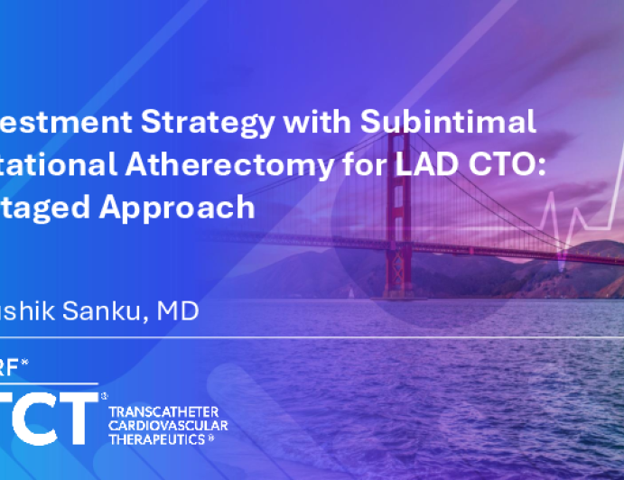 Presentation TCT 2025 TCT 1603: Investment Strategy With Subintimal Rotational Atherectomy for LAD CTO: A Staged Approach Presenter: Koushik Sanku October 27, 2025 REGISTER for free or LOG IN to view this content TCT 2025 Up Next Presentation TCT 2025 Lessons From Memorable CHIP Cases That Challenged Me Most Presenter: Hung Q. Ly October 27, 2025 More slides + Presentation TCT 2025 TCT 1886: Guidezilla-Facilitated Stent Delivery Through Stent Strut Cells: First Report Presenter: Yanan Gao October 27, 2025 Presentation TCT 2025 TCT 1783: Error 404. Oops…No Access Found: When You Are Stuck in a Rut Between Radial and Femoral Access, but Then a High-Risk Patient With Acute Coronary Syndrome and Cardiogenic Shock Turns Your Day Around Presenter: Daniel Todaro October 27, 2025 We Recommend Disclosures <p>Nothing to disclose</p>
