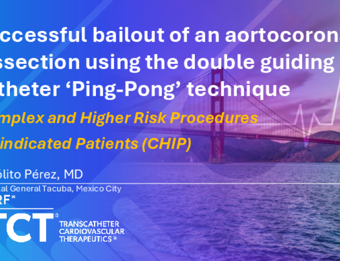 Presentation TCT 2025 TCT 1606: Successful Bailout of Aortocoronary Dissection via Dual-Guiding 'Ping-Pong' Technique Presenter: Hipolito Alfredo Perez Sandoval October 27, 2025 REGISTER for free or LOG IN to view this content TCT 2025 Up Next Presentation TCT 2025 TCT 1785: Murphy’s Law in the ICCU: A Cascade of Impella-Related Complications in a Young STEMI Patient Presenter: Federica Barbara Beatrice Testerini October 27, 2025 More slides + Presentation TCT 2025 TCT 1912: Successful Recanalization of Occluded Aortobifemp Bypass Graft Using Gen 2 inThrill Device Presenter: Mehmet Cilingiroglu October 27, 2025 Presentation TCT 2025 TCT 1850: Maintaining Radiation Protection During Complication Management: A Case Report Using the Texray MasterPeace™ System in Complex PCI Presenter: Oskar Angerås October 27, 2025 We Recommend Disclosures <p>Nothing to disclose</p>