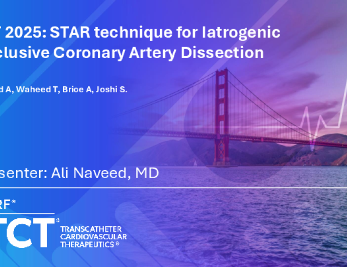 Presentation TCT 2025 TCT 1613: STAR Technique for Iatrogenic Occlusive Coronary Artery Dissection Presenter: Ali Naveed October 27, 2025 REGISTER for free or LOG IN to view this content TCT 2025 Up Next Presentation TCT 2025 TCT 1442: Bilateral Leaflet Splitting of a Completely Misaligned TAVR Using the ShortCut Device Presenter: Jadon Ray Rajagopal October 27, 2025 More slides + Presentation TCT 2025 My Tips and Tricks for Aortic Leaflet Modification Presenter: John Thomas Saxon October 27, 2025 Presentation TCT 2025 My Tips and Tricks for Prevention and Management of CTO Dissections Presenter: Francis Joshi October 27, 2025 We Recommend Disclosures <p>Nothing to disclose</p>