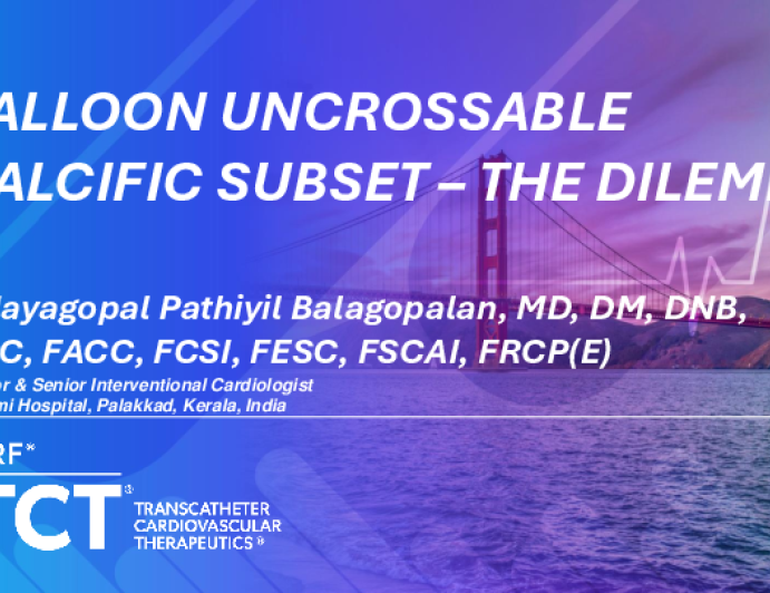 Presentation TCT 2025 TCT 1616: Balloon Uncrossable Calcific Subset: The Dilemma Presenter: Jayagopal Pathiyil Balagopalan October 26, 2025 REGISTER for free or LOG IN to view this content TCT 2025 Up Next Presentation TCT 2025 TCT 1617: Stone at the Gate: A Tale of Burrs, Balloons, Laser and Lithotripsy Presenter: Anwar Hussain October 26, 2025 More slides + Presentation TCT 2025 TCT 1618: A Case of Device Passage Difficulty in a Calcified and Tortuous Lesion: What Do You Do When You Fail to Exchange to a Guidewire for Rotational Atherectomy? Presenter: Masafumi Himeno October 26, 2025 Presentation TCT 2025 My Most Memorable Lessons From Complications Involving Circulatory Support Presenter: Jarrod Frizzell October 26, 2025 We Recommend Disclosures <p>Nothing to disclose</p>