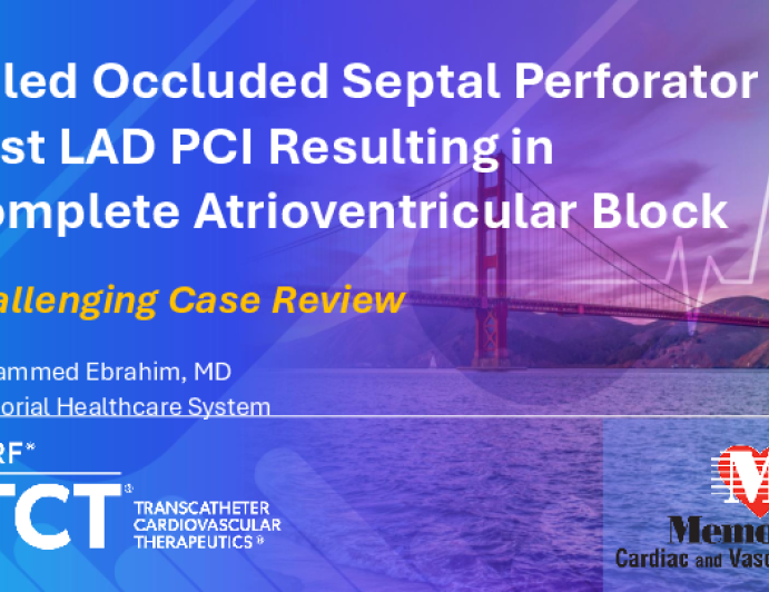 Presentation TCT 2025 TCT 1656: Jailed Septal Perforator Post PCI Resulting in Complete Atrioventricular Block Presenter: Mohammed Ebrahim October 27, 2025 REGISTER for free or LOG IN to view this content TCT 2025 Up Next Presentation TCT 2025 TCT 1657: Compressive Coronary Hematoma in Elderly Woman After Initiation of Oral Anticoagulant Presenter: Kais Ouerghi October 27, 2025 More slides + Presentation TCT 2025 TCT 1659: Sealing the Threat: Successful Management of Aorto-Ostial Dissection in the Cath Lab Presenter: Ankit Gupta October 27, 2025 Presentation TCT 2025 TCT 1660: Dual Lumen Dilemma: OCT-Guided PCI of Wire-Induced RCA Dissection Presenter: Uneza Khawaja October 27, 2025 We Recommend Disclosures <p>Nothing to disclose</p>