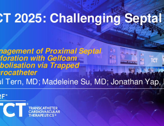 Presentation TCT 2025 TCT 1675: Challenging Septal: Management of a Perforated Proximal Septal Artery Presenter: Paul Tern October 27, 2025 REGISTER for free or LOG IN to view this content TCT 2025 Up Next Presentation TCT 2025 TCT 1673: A Coronary Perforation After Post-Dilation Complication Management and Role of IVUS Presenter: Khoa Anh Phan October 27, 2025 More slides + Presentation TCT 2025 TCT 1345: A Shell of a Man: Percutaneous Transcatheter Mitral Valve in Valve Replacement in Heart Failure With Multi-Organ Failure Presenter: Jonathan Schilling October 27, 2025 Presentation TCT 2025 TCT 1343: Cryptogenic Dysphonia: A Case of PFO Associated Dysphonia Presenter: F. David Fortuin October 27, 2025 We Recommend Disclosures <p>Nothing to disclose</p>