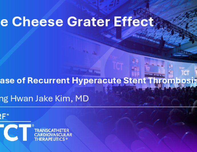 Presentation TCT 2025 TCT 1676: The Cheese Grater Effect: A Case of Recurrent Hyperacute In Stent Thrombosis Presenter: Jeong Hwan Jake Kim October 27, 2025 REGISTER for free or LOG IN to view this content TCT 2025 Up Next Presentation TCT 2025 TCT 1677: Managing Acute Coronary Syndrome in the Context of High Thrombotic Burden and P2Y12 Inhibitor Resistance Presenter: Amitoj Singh October 27, 2025 More slides + Presentation TCT 2025 TCT 1678: Acute Coronary Stent Thrombosis Caused by Drug-Induced Autoimmune Hemolytic Anemia Presenter: Ágnes Szappanos October 27, 2025 Presentation TCT 2025 TCT 1679: A Case of ACS-PCI Complicated by Progressive In-Stent Thrombosis: Strategies and Lessons Presenter: Daisuke Terashita October 27, 2025 We Recommend Disclosures <p>Nothing to disclose</p>