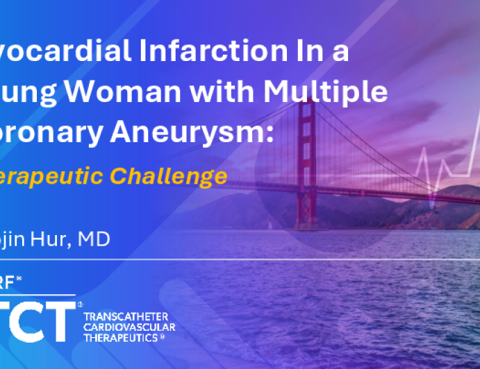 Presentation TCT 2025 TCT 1684: Myocardial Infarction in a Young Woman With Multiple Coronary Aneurysms: Therapeutic Challenge Presenter: Seojin Hur October 25, 2025 REGISTER for free or LOG IN to view this content TCT 2025 Up Next Presentation TCT 2025 TCT 1685: Multivessel STEMI From Left Ventricular Thromboembolism in a Young Patient With Titin Gene Mutation and Myocarditis Presenter: Afaq Motiwala October 25, 2025 More slides + Presentation TCT 2025 TCT 1431: A Complex Case of Post-TAVR Paravalvular Leak Closure Presenter: Nina Shyama Appareddy October 25, 2025 Presentation TCT 2025 TCT 1628: Air Embolus Extraction Via Mechanical Thrombectomy Device: A Case Report Presenter: Samuel Moore October 25, 2025 We Recommend Disclosures <p>Nothing to disclose</p>