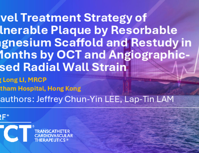 TCT 1703: Novel Treatment Strategy of Vulnerable Plaque by Resorbable Magnesium Scaffold and Restudy in 6 Months by OCT and Angiographic-Based Radial Wall Strain