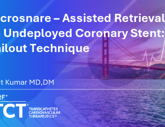 Presentation TCT 2025 TCT 1719: Microsnare-Assisted Retrieval of an Undeployed Coronary Stent: A Bailout Technique Presenter: Amit Kumar October 27, 2025 REGISTER for free or LOG IN to view this content TCT 2025 Up Next Presentation TCT 2025 TCT 235: Efficacy of Bioresorbable Vascular Scaffold vs Drug-Eluting Stents After PCI : A GRADE-Assessed Systematic Review and Meta-Analysis of Randomised Controlled Trials Presenter: Sultana Jahan October 26, 2025 More slides + Presentation TCT 2025 Hybrid Trial Designs and Real-World Evidence: Will They Ever Be Prime Time? Presenter: Robert W. Yeh October 27, 2025 Presentation TCT 2025 Placebo-Controlled Interventional Trials: A Sham No More Presenter: Rasha Al-Lamee October 27, 2025 We Recommend Disclosures <p>Nothing to disclose</p>