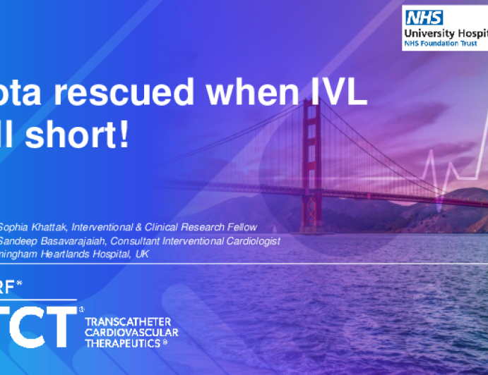 Presentation TCT 2025 TCT 1727: Rota Rescued When IVL Fell Short Presenter: Sophia Khattak October 26, 2025 REGISTER for free or LOG IN to view this content TCT 2025 Up Next Presentation TCT 2025 TCT 1730: Rotational Atherectomy in a Patient With ST-Segment Elevation Myocardial Infarction: From Relative Contraindication to Salvation Presenter: Michail Papafaklis October 26, 2025 More slides + Presentation TCT 2025 TCT 1869: Rotational Atherectomy: Managing Burr Entrapment Presenter: Qais Radaideh October 26, 2025 Presentation TCT 2025 TCT 1732: Back From the Brink: Complex LMS/LAD PCI With Intra-Procedural Arrest, Rotablation, IVL and Drug-Coated Balloon Rescue Presenter: Joseph Appiah October 26, 2025 We Recommend Disclosures <p>Nothing to disclose</p>