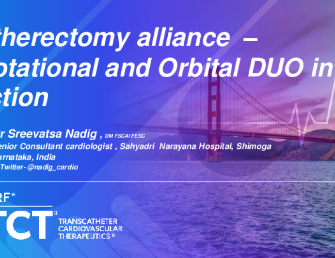 Presentation TCT 2025 TCT 1729: Atherectomy Alliance: Rotational and Orbital DUO in Action Presenter: Sreevatsa S. Nadig October 26, 2025 REGISTER for free or LOG IN to view this content TCT 2025 Up Next Presentation TCT 2025 TCT 1585: Left Main CTO PCI: Navigation Challenges, Delivering Solutions Presenter: Mohammad Ali October 26, 2025 More slides + Presentation TCT 2025 TCT 1411: HFrEF: A Long-Term Journey Marked by One Narrow Escape After Another Presenter: Sunanto Ng October 26, 2025 Presentation TCT 2025 TCT 1832: Right Ventricular Myocardial Infarction in a Patient With Anomalous Right Coronary Artery Origin and Malignant Course Between the Great Arteries Presenter: Spyros Belechakis October 26, 2025 We Recommend Disclosures <p>Nothing to disclose</p>