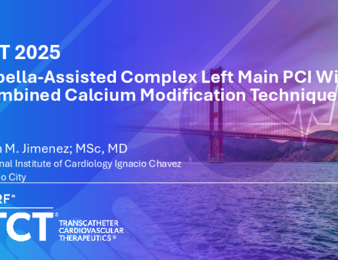 Presentation TCT 2025 TCT 1733: Impella-Assisted Complex Left Main PCI With Combined Calcium Modification Techniques Presenter: Gian Manuel Jimenez-Rodriguez October 26, 2025 REGISTER for free or LOG IN to view this content TCT 2025 Up Next Presentation TCT 2025 TCT 1729: Atherectomy Alliance: Rotational and Orbital DUO in Action Presenter: Sreevatsa S. Nadig October 26, 2025 More slides + Presentation TCT 2025 TCT 1585: Left Main CTO PCI: Navigation Challenges, Delivering Solutions Presenter: Mohammad Ali October 26, 2025 Presentation TCT 2025 TCT 1411: HFrEF: A Long-Term Journey Marked by One Narrow Escape After Another Presenter: Sunanto Ng October 26, 2025 We Recommend Disclosures <p>Nothing to disclose</p>