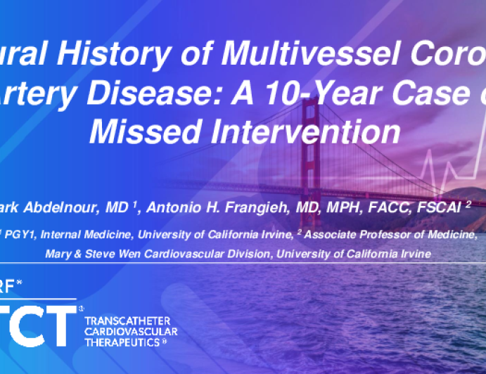 Presentation TCT 2025 TCT 1735: Natural History of Multivessel Coronary Artery Disease: A 10-Year Case of Missed Intervention Presenter: Mark W. Abdelnour October 26, 2025 REGISTER for free or LOG IN to view this content TCT 2025 Up Next Presentation TCT 2025 TCT 1734: A Bail-out Therapeutic Strategy in a STEMI Patient Presenter: Andreas Mavroudis October 26, 2025 More slides + Presentation TCT 2025 Tips and Tricks on Dealing With Calcium in Bifurcations Presenter: Evald H. Christiansen October 26, 2025 Presentation TCT 2025 TCT 1871: Left Main Bifurcation Stenting: A Successful Case Demonstrating a Combination of Calcium Modification Therapies Presenter: Michael Killian October 26, 2025 We Recommend Disclosures <p>Nothing to disclose</p>