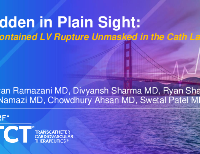 Presentation TCT 2025 TCT 1743: Hidden in Plain Sight: A Contained LV Rupture Unmasked in the Cath Lab Presenter: Noyan Ramazani October 27, 2025 REGISTER for free or LOG IN to view this content TCT 2025 Up Next Presentation TCT 2025 TCT 1741: Against the Odds: Survival of Post Myocardial Infarction VSD Following Transcutaneous VSD Occluder at 1 Year Presenter: Taejun Lee October 27, 2025 More slides + Presentation TCT 2025 TCT 1749: STEMI due to Mitral Valve Annuloplasty Stitch Causing Left Circumflex Occlusion and Large Thrombus Burden: PCI With Thrombectomy Presenter: David Kerling October 27, 2025 Presentation TCT 2025 Skills and Tools Useful in Management of Structural Complications of Myocardial Infarction Presenter: Darren L. Walters October 27, 2025 We Recommend Disclosures <p>Nothing to disclose</p>