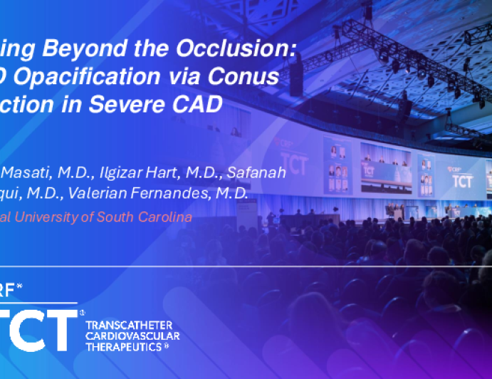 Presentation TCT 2025 TCT 1747: Seeing Beyond the Occlusion: LAD Opacification via Conus Injection in Severe CAD Presenter: Ester Masati October 27, 2025 REGISTER for free or LOG IN to view this content TCT 2025 Up Next Presentation TCT 2025 TCT 1746: Aortic Root Thrombosis With Embolization to the Left Main Artery Presenter: Samuel Robertson October 27, 2025 More slides + Presentation TCT 2025 Lessons I Learned From My Most Memorable Unusual MI Intervention Presenter: Ahmed Magdy October 27, 2025 Presentation TCT 2025 TCT 1745: Neck to Heart: Penetrating Trauma Unmasks a Double Edged Emergency Presenter: Mohit Pahuja October 27, 2025 We Recommend Disclosures <p>Nothing to disclose</p>