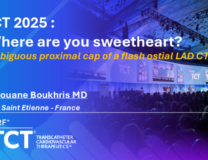 Presentation TCT 2025 TCT 1813: Where Are You Sweetheart? Ambiguous Proximal Cap of a Flash Ostial LAD CTO Presenter: Marouane Boukhris October 28, 2025 REGISTER for free or LOG IN to view this content TCT 2025 Up Next Presentation TCT 2025 TCT 1814: Find the Way to Truth Presenter: Pang-shuo Huang October 28, 2025 More slides + Presentation TCT 2025 TCT 1522: Medicus Curat, Natura Sanat Presenter: Debora Russo October 28, 2025 Presentation TCT 2025 TCT 1519: Jailed, but Unharmed: Navigating Bi-Caval TricValve Implantation in Tricuspid Regurgitation With Multiple Pre-Existing Leads: A Complex Case From the TRICAV I US Early Feasibility Study Presenter: Brian K. Whisenant October 28, 2025 We Recommend Disclosures <p>Nothing to disclose</p>