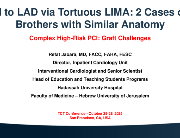Presentation TCT 2025 TCT 1828: PCI to LAD via Tortuous LIMA: 2 Cases of 2 Brothers With Similar Anatomy Presenter: Refat Jabara October 26, 2025 REGISTER for free or LOG IN to view this content TCT 2025 Up Next Presentation TCT 2025 TCT 1829: Right Transradial Approach for LIMA Angiography and PCI of LAD via LIMA Graft Presenter: Riddhi Ramanlal October 26, 2025 More slides + Presentation TCT 2025 TCT 1830: Balloon Assisted Fenestration Technique in the Treatment of Left Internal Mammary Artery Dissection Presenter: George Besis October 26, 2025 Presentation TCT 2025 TCT 1794: Intraoperative Left Main Coronary Occlusion During Redo MVR: Salvage PCI With Dual Mechanical Support Presenter: Mohammed Salih October 26, 2025 We Recommend Disclosures <p>Nothing to disclose</p>