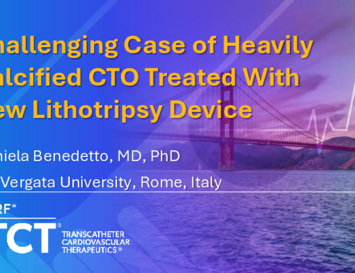 Presentation TCT 2025 TCT 1846: Challenging Case of Heavily Calcified CTO Treated With New Lithotripsy Device Presenter: Daniela Benedetto October 27, 2025 REGISTER for free or LOG IN to view this content TCT 2025 Up Next Presentation TCT 2025 TCT 1449: VIV-TAVR With Navitor for Small Annulus and Severely Angulated Aorta: Snaring and BVF Approach Presenter: Ju Han Kim October 27, 2025 More slides + Presentation TCT 2025 TCT 1405: Accurate Positioning of Balloon-Expandable Valve for Aortic Stenosis With Huge Left Ventricular Outflow Tract Calcification Presenter: Aoi Omori October 27, 2025 Presentation TCT 2025 TCT 1436: Moderate Intraprosthetic Aortic Insufficiency Immediately After Implantation That Self-Resolved on One-Month Follow-Up Echocardiogram Presenter: Marlena Lesniowska October 27, 2025 We Recommend Disclosures <p>Nothing to disclose</p>