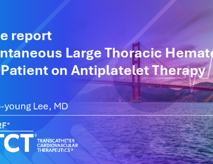Presentation TCT 2025 TCT 1852: Case Report: Spontaneous Large Thoracic Hematoma in a Patient on Antiplatelet Therapy Presenter: Soo-Young Lee October 28, 2025 REGISTER for free or LOG IN to view this content TCT 2025 Up Next Presentation TCT 2025 TCT 1885: Samurai's Crush: A Novel Technique to Optimize Protruding Stent Into the Left Main Artery Without a Wire Across Presenter: Arun Mohan October 28, 2025 More slides + Presentation TCT 2025 TCT 1640: "Double Zero PCI" in a Patient With Contrast Anaphylaxis Shock Presenter: Tan Chen Ting October 28, 2025 Presentation TCT 2025 TCT 1701: Is an Invasive Coronary Angiography Enough? Presenter: Barbara Zdzierak October 28, 2025 We Recommend Disclosures <p>Nothing to disclose</p>