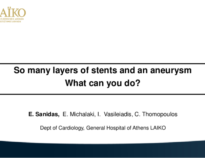 Presentation TCT 2025 TCT 1856: So Many Layers of Stents and an Aneurysm: What Can You Do? Presenter: Elias Sanidas October 27, 2025 REGISTER for free or LOG IN to view this content TCT 2025 Up Next Presentation TCT 2025 Tips and Tricks for Management of Coronary Aneurysms and Pseudoaneurysms Presenter: Davide Cao October 27, 2025 More slides + Presentation TCT 2025 TCT 1484: CLEVE to the Rescue: Leveraging Innovation in Novel Leaflet Modification to Improve Patient Outcomes Presenter: Dhiran Verghese October 27, 2025 Presentation TCT 2025 TCT 1483: Transcatheter Valve Implant With Leaflet Modification for Severe Calcific Mitral Valve Stenosis in a Young Man With Previous Mitral Valve Pericardial Patch and Ring Repair Presenter: Shikha Jha October 27, 2025 We Recommend Disclosures <p>Nothing to disclose</p>