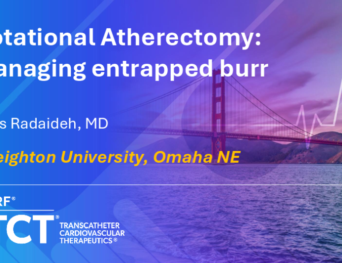 Presentation TCT 2025 TCT 1869: Rotational Atherectomy: Managing Burr Entrapment Presenter: Qais Radaideh October 26, 2025 REGISTER for free or LOG IN to view this content TCT 2025 Up Next Presentation TCT 2025 TCT 1732: Back From the Brink: Complex LMS/LAD PCI With Intra-Procedural Arrest, Rotablation, IVL and Drug-Coated Balloon Rescue Presenter: Joseph Appiah October 26, 2025 More slides + Presentation TCT 2025 TCT 1408: Transcatheter Aortic Valve Replacement (TAVR) and the Left Main Challenge: Risk Stratification and Bailout Strategies Presenter: Enhua Wang October 26, 2025 Presentation TCT 2025 TCT 1407: Transcatheter Aortic Valve Replacement Prosthesis Selection: A Case of Annular and Sinotubular Junction Size Mismatch Presenter: Logan L. Vincent October 26, 2025 We Recommend Disclosures <p>Nothing to disclose</p>
