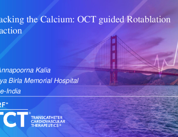 Presentation TCT 2025 TCT 1873: Cracking the Calcium: OCT Guided Rotablation in Action Presenter: Annapoorna Ajit Kalia October 26, 2025 REGISTER for free or LOG IN to view this content TCT 2025 Up Next Presentation TCT 2025 TCT 1410: Safe Passage: Prevention of Left Main Coronary Artery Occlusion During TAVR Presenter: Ammer Aldairi October 26, 2025 More slides + Presentation TCT 2025 TCT 1875: Orbital Atherectomy and OCT Guided Severely Calcified Distal Left Main Bifurcation Stenting: The O2 Advantage Presenter: Sudarshan K. Vijay October 26, 2025 Presentation TCT 2025 TCT 1942: Percutaneous Aspiration of a Suspected Papillary Fibroelastoma Revealing an Exuberant Lambl’s Excrescence: A Novel Transcatheter Approach Presenter: James Foster Howick October 26, 2025 We Recommend Disclosures <p>Nothing to disclose</p>