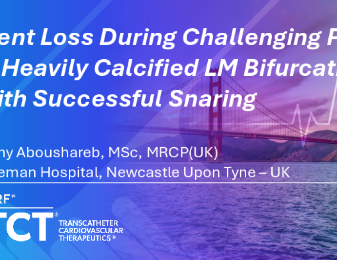 Presentation TCT 2025 TCT 1882: Stent Loss During Challenging PCI of Heavily Calcified LM Bifurcation With Successful Snaring Presenter: Fathy Aboushareb October 28, 2025 REGISTER for free or LOG IN to view this content TCT 2025 Up Next Presentation TCT 2025 TCT 1811: CCTA-Guided PCI With OCT Correlation: Precision Procedural Planning Presenter: Marc El Khoury October 28, 2025 More slides + Presentation TCT 2025 TCT 1868: Rota Burr Stuck in Calcified Tortuous LCx in Heavily Calcified Double CTO With Unprotected LM TVD Presenter: Saroj Kumar Sahoo October 28, 2025 Presentation TCT 2025 TCT 1866: Challenging Coronary Calcium: The Importance of the Seat Belt Presenter: Mauricio Oliveira October 28, 2025 We Recommend Disclosures <p>Nothing to disclose</p>