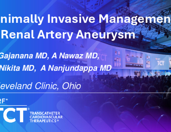 Presentation TCT 2025 TCT 1914: Minimally Invasive Management of Renal Artery Aneurysm Presenter: Deepakraj Gajanana October 27, 2025 REGISTER for free or LOG IN to view this content TCT 2025 Up Next Presentation TCT 2025 TCT 1915: Iatrogenic Perforation During Percutaneous Intervention of Renal Artery CTO: Its Management and Long-Term Follow-Up Presenter: Rajesh Vijayvergiya October 27, 2025 More slides + Presentation TCT 2025 TCT 1388: Tamponade on Purpose: A Novel Life-Saving Approach for Annular Rupture Post-TAVI Presenter: Aladdin Bashir October 27, 2025 Presentation TCT 2025 TCT 1387: Unexpected Cardiac Tamponade Post Transcather Aortic Valve Implantation Diagnostic and Therapeutic Challenges Presenter: Rocio Fernandez Montalvetti October 27, 2025 We Recommend Disclosures <p>Nothing to disclose</p>