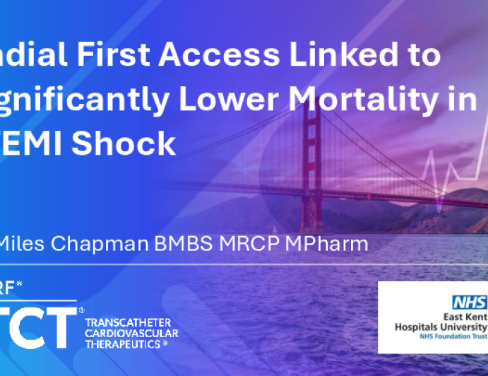 Presentation TCT 2025 TCT 266: Radial First Access Linked to Significantly Lower Mortality in STEMI Shock Presenter: Miles Chapman October 28, 2025 REGISTER for free or LOG IN to view this content TCT 2025 Up Next Presentation TCT 2025 TCT 1052: Identifying High-Risk Pulmonary Embolism Patients Through Combined Hemodynamic and Thrombotic Assessment Presenter: Marco G. Mennuni October 28, 2025 More slides + Presentation TCT 2025 TCT 267: Cardiogenic Shock Outcomes in Coronary Artery Disease (1999-2023): A Longitudinal Study of Mortality and Disparities. Presenter: Ahmed Bahnasy October 28, 2025 Presentation TCT 2025 TCT 200: Association between the Occurrence of Coronary In-Stent Restenosis in Post-Renal Transplant Recipients and Adverse Cardiovascular Events Presenter: Aakash Rana October 28, 2025 We Recommend Disclosures <p>Nothing to disclose</p>