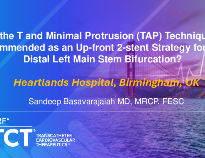 TCT 364: Can the T and Minimal Protrusion (TAP) Technique be Recommended as an Up-front 2-stent Strategy for True Distal Left Main Stem Bifurcation?