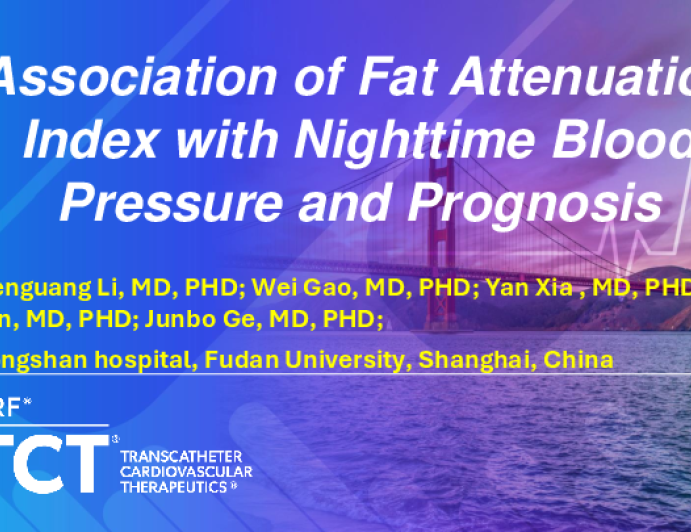 Presentation TCT 2025 TCT 431: Association of Fat Attenuation Index with Nighttime Blood Pressure and Prognosis Presenter: Wei Gao October 27, 2025 REGISTER for free or LOG IN to view this content TCT 2025 Up Next Presentation TCT 2025 TCT 910: Novel Hybrid Drug-Eluting BioStealth™ Stent for Below-the-Knee Lesions: Preclinical Results and Proposed Pivotal Clinical Trial Presenter: Terumitsu Hasebe October 27, 2025 More slides + Presentation TCT 2025 TCT 430: Photon-Counting Detector Computed Tomography for the Assessment of Coronary Stents and In-Stent Restenosis Presenter: Doosup Shin October 27, 2025 Presentation TCT 2025 TCT 92: Twelve-Month Prognostic Impact of Acute Kidney Injury Following Impella-Supported High-Risk PCI Presenter: Jerzy Sacha October 27, 2025 We Recommend Disclosures <p>Nothing to disclose</p>