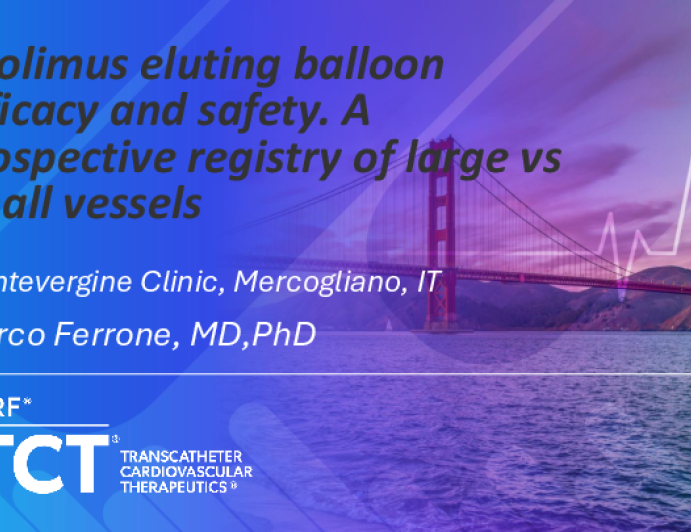 Presentation TCT 2025 TCT 519: Sirolimus eluting balloon efficacy and safety. A prospective registry of large vs small vessels Presenter: Marco Ferrone October 28, 2025 REGISTER for free or LOG IN to view this content TCT 2025 Up Next Presentation TCT 2025 TCT 520: Revascularization in HBR Made Safer: Leveraging Sirolimus-DCB and SAPT Presenter: Victor Alfonso Jimenez Diaz October 28, 2025 More slides + Presentation TCT 2025 TCT 518: Impact of Left Ventricular Ejection Fraction on Outcomes with Drug-Coated Balloon versus Drug-Eluting Stent for de novo Coronary Artery Disease: Insights from the REC-CAGEFREE I Trial Presenter: Bo Song October 28, 2025 Presentation TCT 2025 TCT 673: IVUS-Based Predictors of Peri-procedural Success and Failure in Drug-Coated Balloon–Only PCI: A Prespecified Subanalysis of the NATURE Trial Presenter: Taku Asano October 28, 2025 We Recommend Disclosures <p>Nothing to disclose</p>