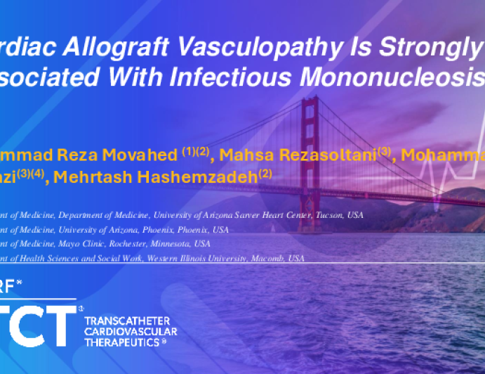Presentation TCT 2025 TCT 537: Cardiac Allograft Vasculopathy Is Strongly Associated With Infectious Mononucleosis Presenter: Mahsa Rezasoltani October 27, 2025 REGISTER for free or LOG IN to view this content TCT 2025 Up Next Presentation TCT 2025 TCT 536: Percutaneous Transluminal Caval-flow Regulation PTCR®: An Emerging Innovation to Reduce Total Cardiac Burden in Heart Failure Patients, A Change of Paradigm in the Horizon Presenter: Jose E. Herrera October 27, 2025 More slides + Presentation TCT 2025 TCT 538: Real-World Outcomes Following Cardiac Contractility Modulation in HFrEF: A Single-Center Retrospective Experience Presenter: Kareem Elgendi October 27, 2025 Presentation TCT 2025 TCT 541: Left Bundle Branch Area Pacing Is Non Inferior To CRT Pacing in Heart Failure with Reduced LVEF, 7 years Follow Up Study From Eastren India Presenter: Sudeb Mukherjee October 27, 2025 We Recommend Disclosures <p>Nothing to disclose</p>