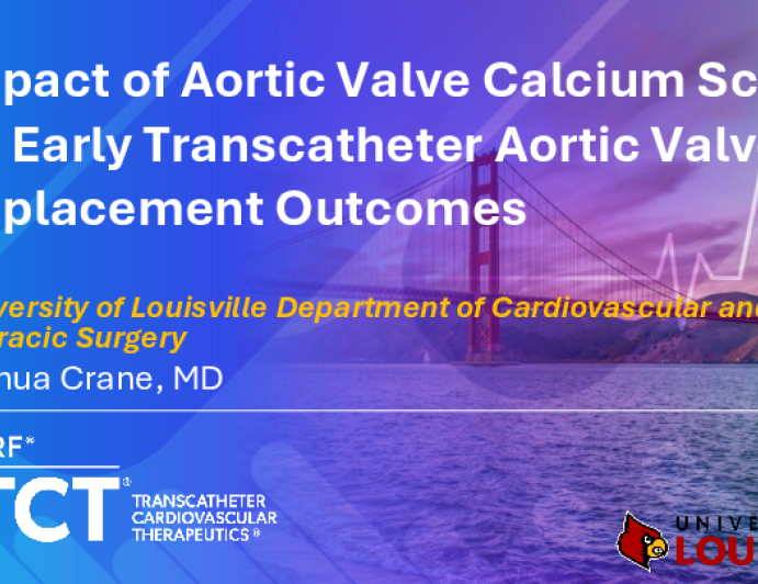 Presentation TCT 2025 TCT 596: Impact of Aortic Valve Calcium Score on Early Transcatheter Aortic Valve Replacement Outcomes Presenter: Joshua Crane October 27, 2025 REGISTER for free or LOG IN to view this content TCT 2025 Up Next Presentation TCT 2025 TCT 594: Ultra Low Contrast Computed Tomography (CT) for Transcatheter Aortic Valve Replacement (TAVR) Planning Presenter: Lesley M. Field October 27, 2025 More slides + Presentation TCT 2025 TCT 595: Cardiac Damage Staging in Moderate or Greater Aortic Regurgitation: A New Framework for Risk Stratification Presenter: Francisco Alexandrino October 27, 2025 Presentation TCT 2025 TCT 593: Aortic Valve Leaflet Motion for Diagnosis and Classification of Aortic Stenosis Using Single View Echocardiography Presenter: Tom Meredith October 27, 2025 We Recommend Disclosures <p>Nothing to disclose</p>