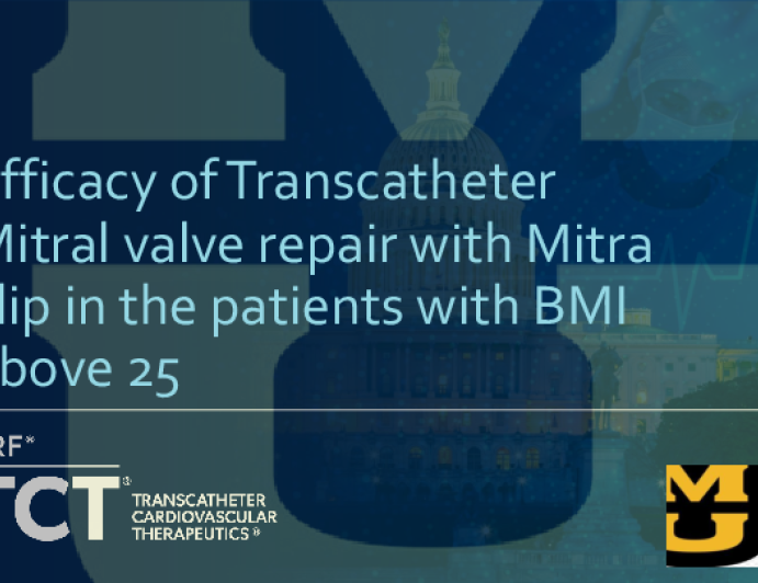 Presentation TCT 2025 TCT 634: Efficacy of Transcatheter Mitral Valve Repair With Mitraclip in Patients WithBMI Above 25 Presenter: Junaid Mir October 26, 2025 REGISTER for free or LOG IN to view this content TCT 2025 Up Next Presentation TCT 2025 TCT 952: Evaluation of the Effect of Hysterectomy in Women Age ≤50 on Post Percutaneous Coronary Intervention Outcomes Through a Retrospective Cohort Study Presenter: Khaled Elnaggar October 26, 2025 More slides + Presentation TCT 2025 TCT 1073: Impact of a Care Coordination Platform on Reperfusion Times for STEMI Patients in a Regional Hub-and-Spoke System Presenter: Marco Spaziano October 26, 2025 Presentation TCT 2025 TCT 956: Outcomes after Percutaneous Coronary Intervention in Patients with Autoimmune Vasculitides Presenter: Robert G. Kropp October 26, 2025 We Recommend Disclosures <p>Nothing to disclose</p>