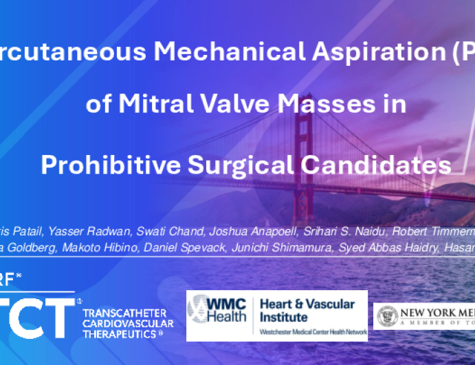 Presentation TCT 2025 TCT 656: Percutaneous Mechanical Aspiration of Mitral Valve Masses in Prohibitive Surgical Candidates Presenter: Haris Patail October 28, 2025 REGISTER for free or LOG IN to view this content TCT 2025 Up Next Presentation TCT 2025 TCT 658: Outcomes of Percutaneous Debulking of Left and Right Side Vegetation in Individuals with Infective Endocarditis Presenter: Alborz Sherafati October 28, 2025 More slides + Presentation TCT 2025 TCT 1055: Innovative Mechanical Thrombectomy Approach: In Vivo Comparison of the Vicora Vibrato Device and Standard of Care in a Porcine Model Presenter: Erin Marie Garcia October 28, 2025 Presentation TCT 2025 TCT 1053: Right Ventricular Myocardial Performance Score as Potential Predictor of Response to Catheter Directed Thrombolytics for Acute Pulmonary Embolism Presenter: Rohan Mundkur October 28, 2025 We Recommend Disclosures <p>Nothing to disclose</p>