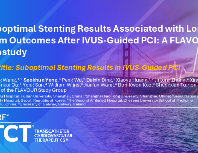 Presentation TCT 2025 TCT 701: Suboptimal Stenting Results and Long-Term Outcomes After Intravascular Ultrasound-Guided PCI Presenter: Seokhun Yang October 27, 2025 REGISTER for free or LOG IN to view this content TCT 2025 Up Next Presentation TCT 2025 TCT 451: Potential Reduction of False Positive STEMI Activations by an Artificial Intelligence ECG Model Presenter: Jonathan G. Schwartz October 27, 2025 More slides + Presentation TCT 2025 TCT 453: Noise-Free Coronary Angiography: Spatial Characteristics and Operator Radiation Exposure Reduction in a Phantom Study Presenter: Chenguang Li October 27, 2025 Presentation TCT 2025 TCT 107: Angiography-derived fractional flow reserve versus intravascular ultrasound to guide percutaneous coronary intervention according to clinical risk and lesion complexity Presenter: Seokhun Yang October 27, 2025 We Recommend Disclosures <p>Nothing to disclose</p>