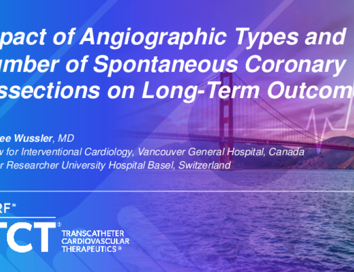 Presentation TCT 2025 TCT 783: Impact of Angiographic Types and Number of Spontaneous Coronary Dissections on Long-Term Outcome Presenter: Desiree Wussler October 26, 2025 REGISTER for free or LOG IN to view this content TCT 2025 Up Next Presentation TCT 2025 TCT 786: Catheter-Induced Iatrogenic Coronary Artery Dissection in Patients With Spontaneous Coronary Artery Dissection Presenter: Desiree Wussler October 26, 2025 More slides + Presentation TCT 2025 TCT 785: Comparative Analysis of Angiography-Derived Indexes of Microvascular Resistance (IMR) Versus Absolute Resistance in an Independent Core Laboratory Presenter: TsungYing Tsai October 26, 2025 Presentation TCT 2025 TCT 787: A Nationwide Analysis of Gender Differences in Myocardial Infarction With Non-Obstructive Coronary Arteries (2016–2022) Presenter: Shivani Mehta October 26, 2025 We Recommend Disclosures <p>Nothing to disclose</p>