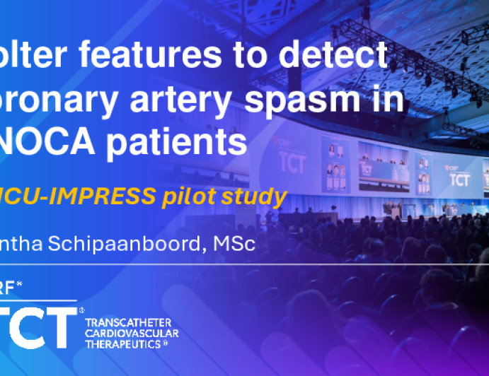 Presentation TCT 2025 TCT 808: Holter Features to Detect Coronary Artery Spasm in ANOCA Patients: a Pilot Study Presenter: Diantha J.M. Schipaanboord October 28, 2025 REGISTER for free or LOG IN to view this content TCT 2025 Up Next Presentation TCT 2025 TCT 809: The prevalence and safety of acetylcholine testing in patients with ANOCA Presenter: Rahul Kurup October 28, 2025 More slides + Presentation TCT 2025 TCT 810: Classifying Coronary Microvascular Dysfunction and Vasospastic Angina after Comprehensive Invasive Functional Testing: Characterizing Coronary Endotypes Presenter: Ronney Shantouf October 28, 2025 Presentation TCT 2025 TCT 1194: Feasibility and Safety of Combined Mitral–Tricuspid TEER in Patients with Dual-Valve Regurgitation Presenter: Dawood Shehzad October 28, 2025 We Recommend Disclosures <p>Nothing to disclose</p>