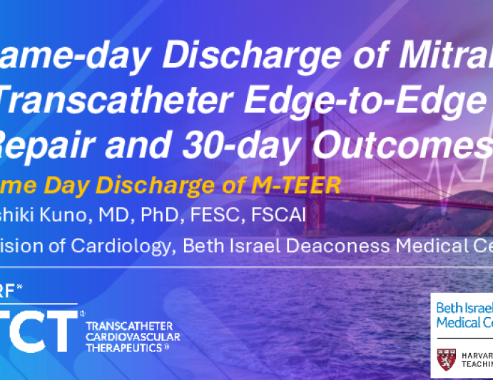 Presentation TCT 2025 TCT 819: Safety of Same-day Discharge After Mitral Transcatheter Edge-to-Edge Repair Presenter: Toshiki Kuno October 25, 2025 REGISTER for free or LOG IN to view this content TCT 2025 Up Next Presentation TCT 2025 TCT 748: Effects of SGLT2 Inhibitors on Major Adverse Cardiovascular Events in Patients with Type 2 Diabetes Mellitus Undergoing Transcatheter Mitral Valve Repair: A Propensity-Matched Analysis Presenter: Mahmoud Abdelnabi October 25, 2025 More slides + Presentation TCT 2025 TCT 750: Guideline-Directed Medical Therapy for Heart Failure after Transcatheter Edge-to-Edge Mitral Valve Repair – A Frequentist and Bayesian Meta-Analysis Presenter: Jesslyn Natalie Hariyanto October 25, 2025 Presentation TCT 2025 TCT 861: Natural History and Clinic Outcomes of Patients with Moderate Mitral Regurgitation Presenter: Abdullah Al-Abcha October 25, 2025 We Recommend Disclosures <p>Nothing to disclose</p>