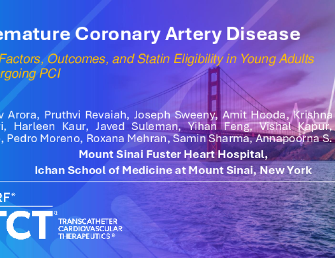 Presentation TCT 2025 TCT 943: Predictors of adverse events in Patients with Premature Coronary Artery Disease undergoing PCI Presenter: Gaurav Kumar Arora October 27, 2025 REGISTER for free or LOG IN to view this content TCT 2025 Up Next Presentation TCT 2025 TCT 1003: Clinical Effectiveness of Glucagon-like peptide-1 receptor agonists on Cardiovascular outcomes Post-PCI in Type 2 Diabetes patients: Findings from the TriNetX Database Presenter: Aymen Ahmed October 27, 2025 More slides + Presentation TCT 2025 TCT 940: Prognostic Role of Alpha Defensin in Predicting Periprocedural Myocardial Injury Following Elective Percutaneous Coronary Intervention Presenter: Rami Abu Fanne October 27, 2025 Presentation TCT 2025 TCT 1000: Time Course of Ischemic and Bleeding Complications in Patients With Acute Coronary Syndrome Managed Invasively Presenter: Fiorenzo Simonetti October 27, 2025 We Recommend Disclosures <p>Nothing to disclose</p>