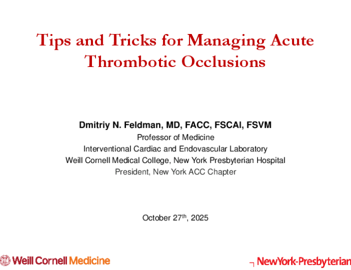 Presentation TCT 2025 Tips and Tricks for Managing Acute Thrombotic Occlusions Presenter: Dmitriy N. Feldman October 27, 2025 REGISTER for free or LOG IN to view this content TCT 2025 Up Next Presentation TCT 2025 TCT 1696: Unsuccessful Manual Thrombectomy in High Thrombus Volume STEMI Patient: What to Do Next? Presenter: Krzysztof Bryniarski October 27, 2025 More slides + Presentation TCT 2025 TCT 1699: Aspiration Thrombectomy of Acute Left Main Thrombotic Occlusion in Cardiogenic Shock: A Picture Is Worth 1000 Words Presenter: Sankalp P. Patel October 27, 2025 Presentation TCT 2025 TCT 1700: The Boundary Between Life and Death: Management of Acute Non-Culprit Coronary Artery Occlusion During STEMI Intervention Presenter: Quan Manh Nguyen October 27, 2025 We Recommend Disclosures <p>Nothing to disclose</p>