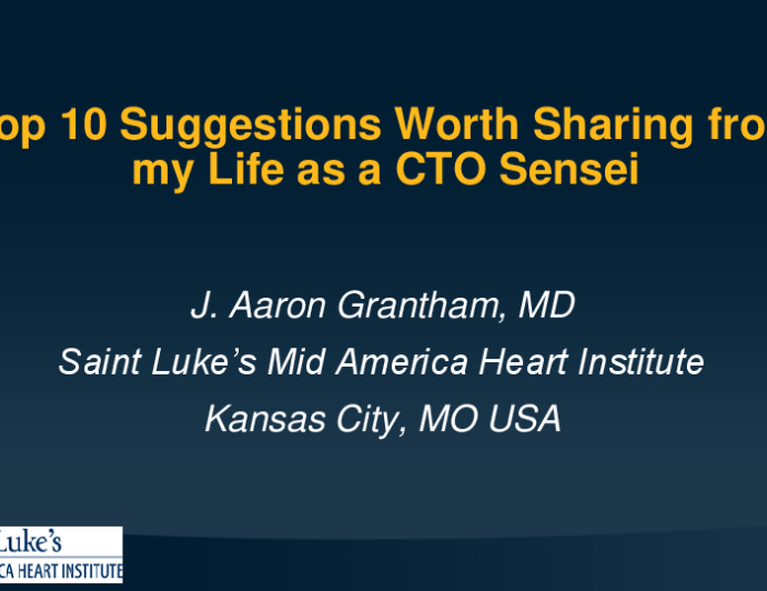 Presentation TCT 2025 Top Ten Suggestions Worth Sharing From My Life as a CTO Sensei Presenter: J. Aaron Grantham October 26, 2025 REGISTER for free or LOG IN to view this content TCT 2025 Up Next Presentation TCT 2025 TCT 1717: Just a Straightforward Bifurcartion Presenter: Glenn Rainey October 26, 2025 More slides + Presentation TCT 2025 TCT 1833: Tripple Whammy: Tortuosity, Calcification and Anomalous RCA PCI in a ACS (Image Guided): A Combination of Rotational Atherectomy and IVL Presenter: Dheeraj Kumar Gandotra October 26, 2025 Presentation TCT 2025 TCT 1495: Transcatheter Edge to Edge Repair in Complex Mitral Valve Anatomy Presenter: Muhammad Saad October 26, 2025 We Recommend Disclosures <p>Nothing to disclose</p>