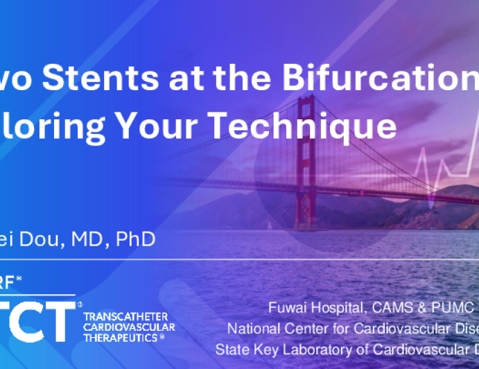 Presentation TCT 2025 Two Stents at the Bifurcation: Tailoring Your Technique Presenter: Kefei Dou October 28, 2025 REGISTER for free or LOG IN to view this content TCT 2025 Up Next Presentation TCT 2025 Provisional Left Main Stenting: Contemporary Considerations Presenter: Duk-Woo Park October 28, 2025 More slides + Presentation TCT 2025 When the Guidelines Don’t Guide: Left Main Revascularization Strategies Presenter: Somjot S. Brar October 28, 2025 Presentation TCT 2025 Lecture with Case Illustration: Broken Unraveled Wire and Microcatheters: When to Take Your Souvenirs Home Presenter: Wissam A. Jaber October 28, 2025 We Recommend Disclosures <p>Nothing to disclose</p>