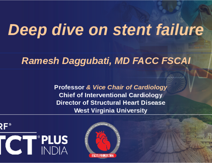 Presentation TCT India 2025 Understanding the etiology and imaging diagnosis of stent failure – acute vs late, morphology, and more Presenter: Ramesh Daggubati July 25, 2025 REGISTER for free or LOG IN to view this content Coronary DES/BRS/DCB Presentation TCT India 2025 Up Next Presentation TCT India 2025 The 2025 approach to stent failure – when to stent, when to DCB, and how to get there Presenter: Ajit Menon July 25, 2025 More slides + Presentation TCT India 2025 Contrast-enhanced laser for ISR – neo-intimal hyperplasia versus stent under-expansion Presenter: Rajendra Kumar Jain July 25, 2025 Presentation TCT India 2025 I would re-stent here Presenter: Rajneesh Kapoor July 25, 2025 We Recommend