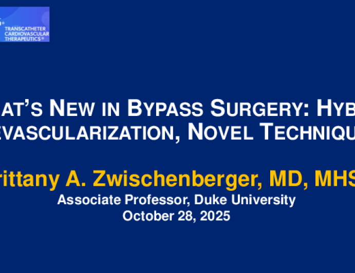 Presentation TCT 2025 What's New in Bypass Surgery: Hybrid Revascularization, Novel Techniques Presenter: Brittany Anne Zwischenberger October 28, 2025 REGISTER for free or LOG IN to view this content TCT 2025 Up Next Presentation TCT 2025 Lecture with Case Illustration: Why Have I Lost Coronary Flow? Presenter: Robert T. Pyo October 28, 2025 More slides + Presentation TCT 2025 Lecture with Case Illustration: How to Respond to Hemodynamic Collapse During PCI Presenter: Ricardo Santiago October 28, 2025 Presentation TCT 2025 Lecture: Refractory Angina: Don’t Treat the Coronaries, Put in a Coronary Sinus Reducer Presenter: Timothy D. Henry October 28, 2025 We Recommend Disclosures <p>Nothing to disclose</p>